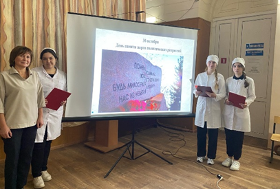 30 октября 2023 в филиале под руководством преподавателя истории Пильщиковой Т. А. было проведено внеаудиторное мероприятие , посвященное памяти жертв политических репрессий.